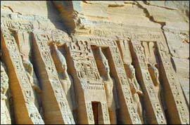 Temple of Hathor Even at his wife's temple, Ramses 2 dominates. Of the 6 statues in front, all about 11,5 metres high, 4 are of him, and only number 2 and 5 are of Nefertari. Similar to the main temple, smaller statues of their children are arranged in pairs around the feet of the larger statues. Over the entrance, there is a frieze of cobras. |