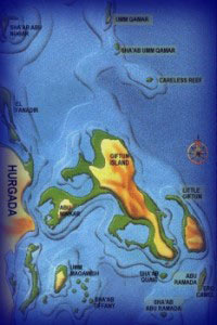| | Careless Reef Two pinnacles rising from a shallow plateau surrounded by deep water. Magnificent coral gardens famous for the numerous giant morays encountered here, as well as the whitetip reef sharks and schooling reef fish. Small Giftun: Several good dives are found on the reefs around this island, the most famous is the drift dive on the giant fan corals at the eastern fringing reefs wall. Big Giftun: Best diving is around on its eastern side, especially at "stone beach" where morays and turtles are found on the hard coral garden found on the upper part of the wall. Abu Ramada Island: Two little islands surrounded by a single reef. Good drift dive along the steep eastern wall, with big fan corals, overhangs and swim throughs. Big groupers and carangids. |