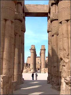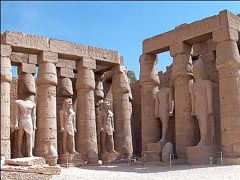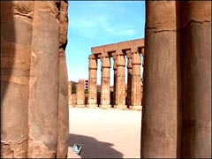 The court of Ramses 2 leads into the Processional Colonnade of Amenophis 3. The decorations on the walls were added by Tutankhamun and Horemheb. The court of Amenophis 3 is surrounded on 3 sides by columns shaped as papyrus bundles and with capitals formed as buds. The court was dedicated to Amun, who Amenophis claimed to be his father. The court was originally roofed, but nothing remains of this. But most of the columns are in excellent condition. Due to the rising water table, a great restoration program was accomplished to strenghten the foundations.