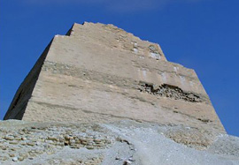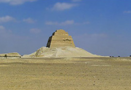 Snefru's first pyramid attempt The collapsed pyramid at Meidum may be the first true pyramid in the world; its contender is the the Bent Pyramid at Dahshur. The pyramid was a refined Mastaba, where the steps of the step pyramid were evened out. The few step pyramids of Ancient Egypt apparently suggested an even greater shape; the dramatic simplicity of the non-stepped pyramid. |
