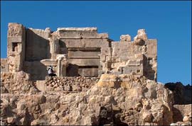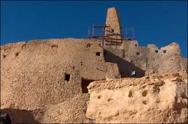 The oracle of Siwa was one of the 6 most influential in the known world of those days. It probably came into use some time in the 6th century, as an expansion of the up to 200 year older temple dedicated to Amon-Re. | | | | The threatening entrance to the temple complex. | The temple itself. It is really very small, but as most visitors never were allowed to enter, just stand on the ground 12 meters beneath, it probably appeared to be quite impressive. | | |