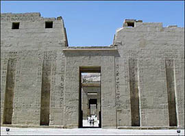 The Medinet Habu is the last great architectural work of the pharaonic period. Not long after Ramses 3 had it built in the 12th century BCE, was Egypt divided. The Arabic name "Medinet Habu" is really not very good, completely unrelated to the original structure. "Mortuary Temple of Ramses 3" would have been correct. But locals believe that the place has a special magical significance. The great model for Ramses 3's temple was the Ramesseum. This lead to decorations where Ramses 3 wages war against Ramses 2's enemies, enemies that since long were far from the military boundaries of his Egypt.