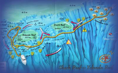 | Strait of Tiran | The Strait of Tiran lies at the mouth of the Gulf of Aqaba and is edged by the west coast of the Sinai on one side and the island of Tiran on the other. In between are the coral reefs of Jackson, Woodhouse, Thomas and Gordon - all named after the 19th Century British cartographers that were the first to map the area. Strong currents characterize this area and with it they bring large quantities of plankton and other nutrients. This provides food for the corals which brings in the reef fish which in turn are eaten by the large pelagic such as barracuda, trevally, tuna and of course sharks - all of which makes great diving. | | Ras Nasrani | | Lying 11 kilometers north of Na'ama Bay and just south of Tiran, Ras Nasrani varies between a moderate to steep slope. The steepest part is to be found just south of the corner and then it flattens out into a spectacular coral plateau. Here at about 10 meters is a perfect example of a red anemone after which you discover large gorgonians, and massive coral heads. Fish life is in abundance with morays hiding in crevices, fusiliers and barracuda schooling off the reef and electric rays skirting around the sand. | | Ras Mohammed | | At the southern most tip if the Sinai, Ras Mohammed is probably the most famous dive site in the region. Because of its geographical position the district is distinguished by massive currents and is famous for its profusion of marine life. Of the various dive sites in the area, Shark and Yolanda reefs are the most popular. On Shark Reef the sheer wall drops over 800 meters in to the abyss. Keeping the wall to your right you will reach the saddle connecting Shark to Yolanda reef named after a Cypriot ship that ran aground here in 1980. The ship latter disappeared in to the blue leaving behind its cargo of bathtubs, wallpaper and household toilets! The best time to visit is in the summer months when the massive schools of barracuda, snapper, unicorn fish and batfish makes it a spectacular dive, never to be forgotten. Dunraven and Beacon Rock Built by Mitchell & Company of Newcastle, the Dunraven was officially described as an "Iron Screw Steamer - Planked" and launched in December 1873. Three years later she became the wreck 7 kilometers from Ras Mohammed at the southern tip of Sha'ab | Shark Bay Also known as Shark's Bay or Beit al-Irsh, this low-key resort camp is about 5 km north of Na'ama Bay. Located on a pebbly beach from which you can walk in to some quite good snorkeling, it is particularly popular with Germans and Israelis, most of whom dive a nearby 15 to 20m deep canyon with the Embark dive club there. Unfortunately, the solitary bliss of this place has been spoilt a bit thanks to the new Pyramiza Hotel being built right. Shark Reef This is the most popular site in the Ras Mohammed region, thanks to the luxuriance of its marine life, its unusual reef structure, its permanent network of moorings, and its easy accessibility for dive boats. The site comprises two huge patch reefs spiraling up to the water surface from the sheer |