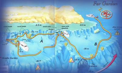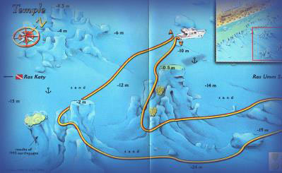 The Gardens Just north of Na'ama Bay, the bay bordering Na'ama Bay to the north is probably the oldest diving region in the area. Because of its proximity to Na'ama, diving began here, in The Gardens, long before the hotels, commercial dive centers and live-aboard first appeared. It is perhaps natural |  | | that the nearest corner to Na'ama became known as Near Garden and the furthest, Far Garden. Near Garden had the edge as far as popularity was concerned. A gentle slope curves down to depths of 20 m (66 feet), then falls off more steeply to depths of 50m (164 feet). Coral outcrops cluster around the large sand patch towards the middle of the slope. This is an excellent spot for night dives, as you will no doubt discover. The central region of the bay, Middle Garden, is a moderate slope reaching depths of 25 m (82 feet). Your preferred dive route takes you between the six largest coral formations which stand out against the background of many smaller ones. The Far Garden features a narrow slope which becomes a wall just beyond the corner of the reef at depths of about 15 m (49 feet). Five imposing patch reefs are arranged in something approximating a straight line in the upper section of the slope. At the base of the slope at a depth . | The Temple One of the oldest and most famous diving sites in the area, lies in the middle of the bay. Countless divers have performed their check-out dives here before setting out on their trips. Conditions are very appropriate for this purpose: seas are calm, depths are not particularly great, and visibility is good. The |  | | Temple is a massive rock cracked along its length on one of its sides, and surrounded by other smaller coral and rock formations. The top of this boulder reaches sea level. The large local fish population seems undeterred by the volume of divers who throng to this site. A friendly Napoleon wrasse is often found among them. | | |