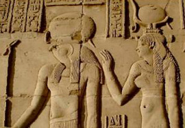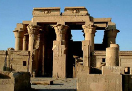 Today only a small town remains, noted for its sugar production and the many Nubians who settled here after their villages were inundated by the Aswan High Dam in the 1960's. | | | | The temple of Kom Ombo is unique in one respect: it is dedicated to two gods, and the entire temple holds two perfectly symmetrical sections. The sanctuary to the left is dedicated to the falcon-headed sky god Harwer (also written Haroeris), or Horus the elder and his family. The one to the left is dedicated to Sobek, the crocodile god, also worshipped in Fayyum.